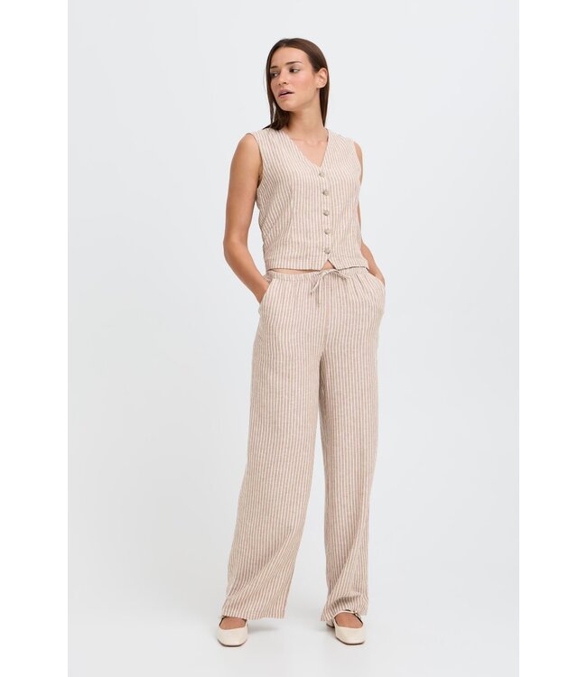 Luchtig, natuurlijk & moeiteloos chic — de b.young BYFALAKKA Long Pants in Woodsmoke Stripe is een comfortabele dames broek met een relaxte pasvorm en warme, stijlvolle uitstraling.