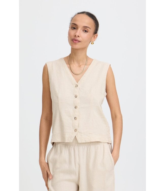 De BYFALAKKA Waistcoat 2 is een mouwloos gilet met een elegante V-hals en knoopsluiting vooraan. De getailleerde snit zorgt voor een flatterend silhouet, terwijl de normale pasvorm en kortere lengte het geheel een moderne uitstraling geven. De luchtige linnenmix voelt licht en comfortabel aan, ideaal voor zowel warme dagen als gelaagde looks.