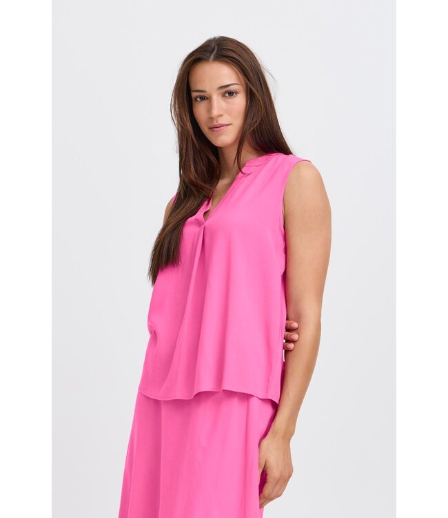 De BYMMJOELLA SL Top 3 van b.young is een mouwloze blouse met een normale, losvallende pasvorm en een lengte tot op de heup. De V-hals met boordje creëert een flatterende halslijn, terwijl het subtiele plooitje aan de voorkant zorgt voor extra bewegingsvrijheid en een mooie valling. De lichte viscose stof voelt zacht en luchtig aan, ideaal voor warme dagen of als stijlvolle laag onder een blazer. Combineer deze top eenvoudig met de bijpassende rok voor een elegante co-ord look.
