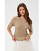 Deze dames top straalt zachtheid en verfijning uit. De lichte camel tint geeft een warme, natuurlijke look die perfect aansluit bij neutrale tinten. Het opengewerkte dessin zorgt voor een luchtige uitstraling met een subtiel romantisch karakter.