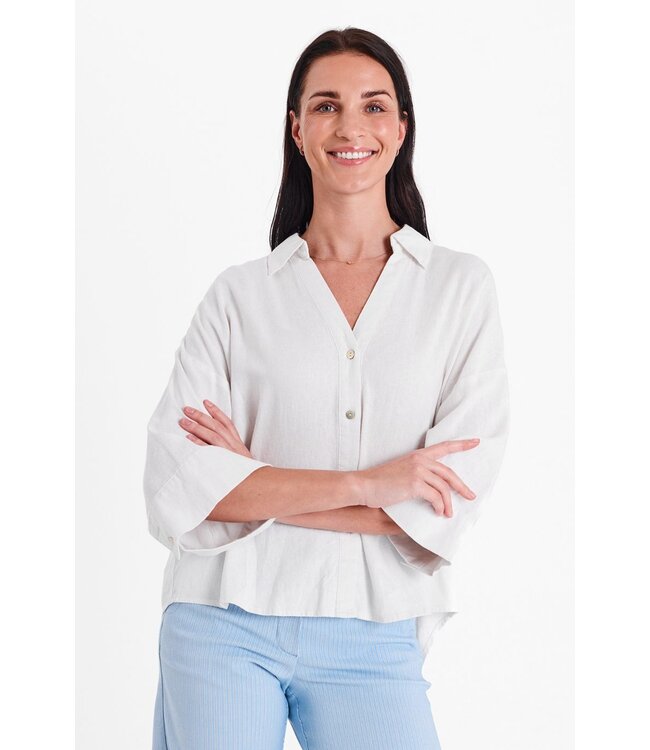 Het FQLAVA Shirt van Freequent is een losvallende blouse met een elegante V-hals en klassieke kraag. De knoopsluiting vooraan en de wijde halflange mouwen zorgen voor een moderne, luchtige uitstraling. De subtiele plooi op de rug geeft extra volume en bewegingsvrijheid. Dankzij de linnenmix voelt de stof licht en ademend aan, perfect voor warmere dagen.