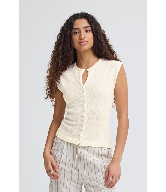 De IHBLONDS top van ICHI is een mouwloos model in fijn breisel met een normale lengte en pasvorm. De V-hals en knoopsluiting vooraan met ton-sur-ton knoopjes geven het ontwerp een subtiel vrouwelijke touch. De geribde zoom zorgt voor een mooie afwerking en een comfortabele fit. Deze dames top is ideaal voor zowel casual als meer geklede gelegenheden.