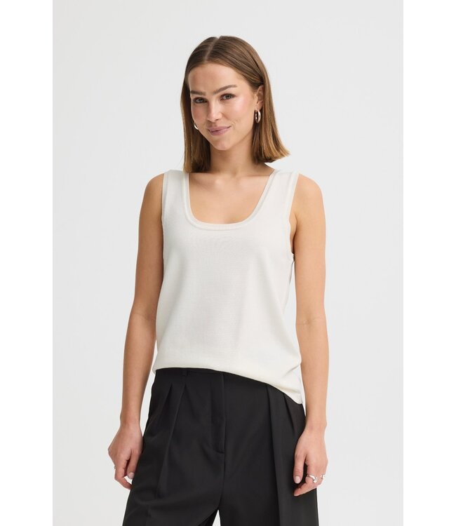 De IHLULS TO is een mouwloze knit top met brede schouderbanden en een ronde hals. De geribde boorden aan hals en schouders geven het ontwerp structuur en zorgen voor een mooie, nette afwerking. Subtiele stikdetails maken het geheel extra verfijnd. Ideaal om solo te dragen op warme dagen, of als zachte basis onder een blazer of vest.