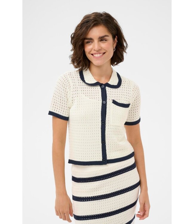 De KAbrianna Knit Cardigan is een fijngebreid vestje met korte mouwen en een verfijnd opengewerkt reliëf. De klassieke kraag, knoopsluiting en borstzak geven het item een subtiel retro karakter. De contrasterende afwerkingen zorgen voor een moderne twist. Draag hem solo als top of combineer hem als set met de bijpassende KAbrianna Knit Skirt voor een stijlvolle co-ord look.