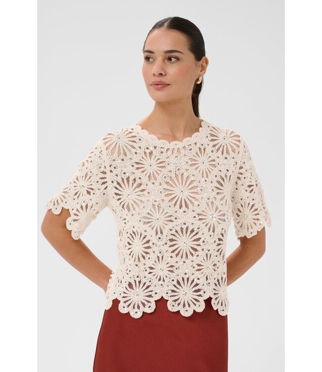 De KAcallista Knit Top van KAFFE is een verfijnde kanten top met een opengewerkt bloemmotief en elegante afwerking. De rechte, losvallende pasvorm zorgt voor een comfortabele fit, terwijl de ellebooglange mouwen en ronde hals een moderne touch geven. De golvende randen aan de zoom en mouwen versterken het vrouwelijke karakter. Dankzij de 100% katoenen samenstelling voelt de top luchtig en aangenaam aan — ideaal voor warme dagen of een geklede zomerse outfit.