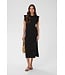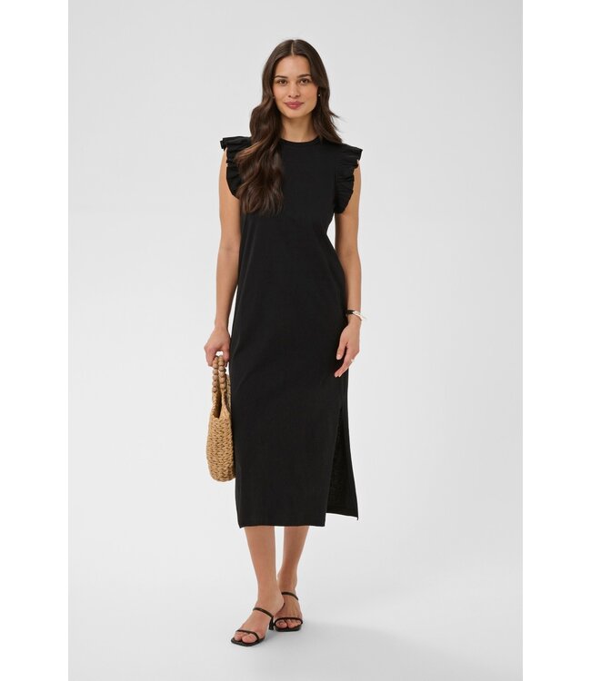 Deze jurk straalt minimalisme met karakter uit. De diepe zwarte kleur zorgt voor een krachtige, tijdloze basis, terwijl de ruches een zachte, vrouwelijke toets toevoegen. Perfect voor een moeiteloos stijlvolle look.