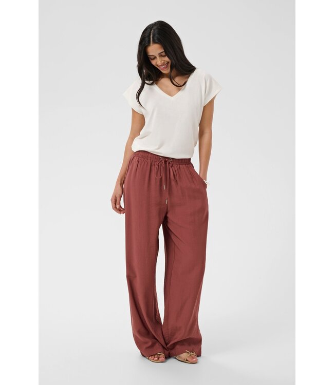 Deze broek straalt relaxte elegantie uit. De vloeiende stof en wijde pijpen zorgen voor een luchtige, zomerse vibe, terwijl de warme henna kleur een stijlvolle en tijdloze touch geeft.