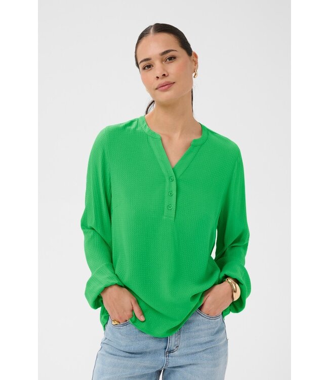 Fris, vrouwelijk en moeiteloos elegant — de Kaffe KAmathilde Blouse in Bright Green is een luchtige damesblouse met subtiele textuur en relaxte pasvorm.