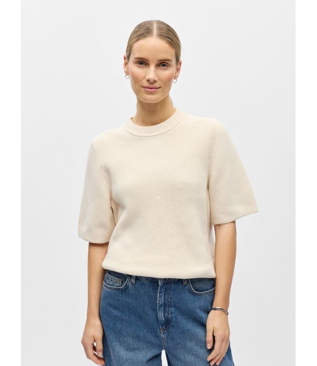 Zacht, clean en modern — de Object OBJFLO Knit Pullover in White Sand is een elegante dames knit met korte mouwen, subtiele textuur en tijdloze uitstraling.