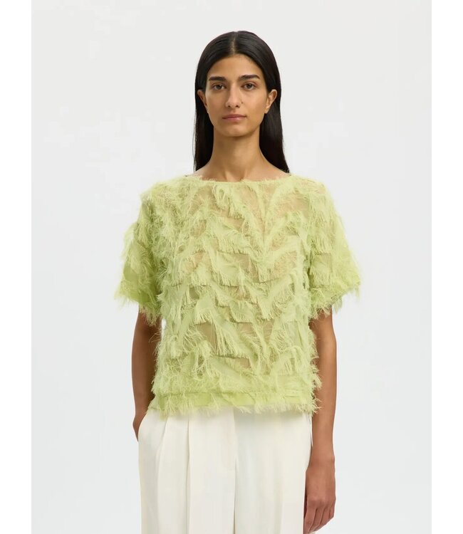 Deze top straalt creativiteit en lichtheid uit. De speelse franjes en transparante textuur geven een dynamisch effect, terwijl de zachte groentint zorgt voor een frisse en zomerse vibe. Perfect voor een moderne, opvallende look.